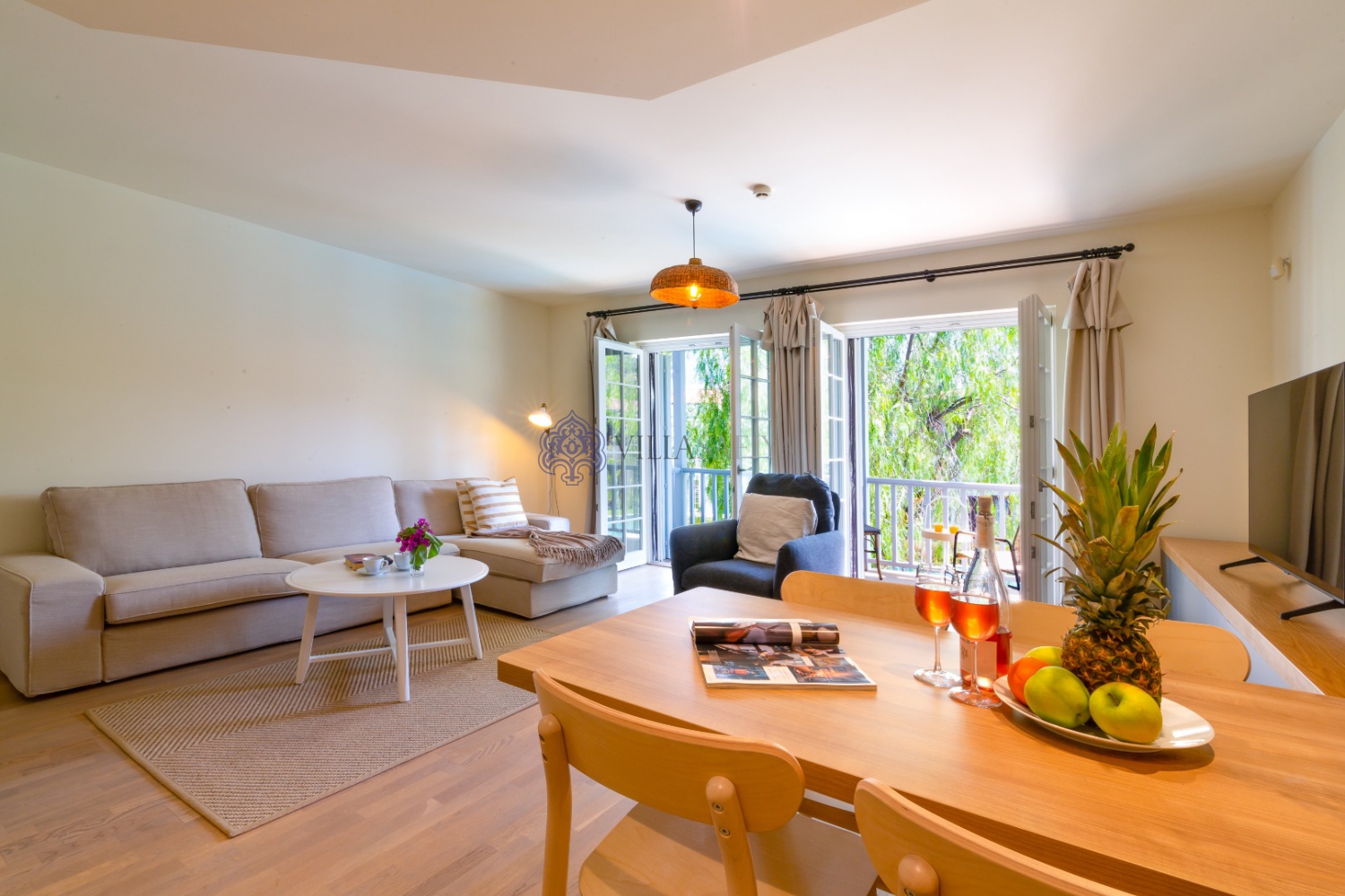 - Özenle seçilmiş mobilyalarla donatılmış geniş bir oturma odası, balkondan havuz manzarası, 6 kişilik kanepe, lcd tv ve tam donanımlı mutfak, etrafta dolaşabilmeniz için bisikletler.