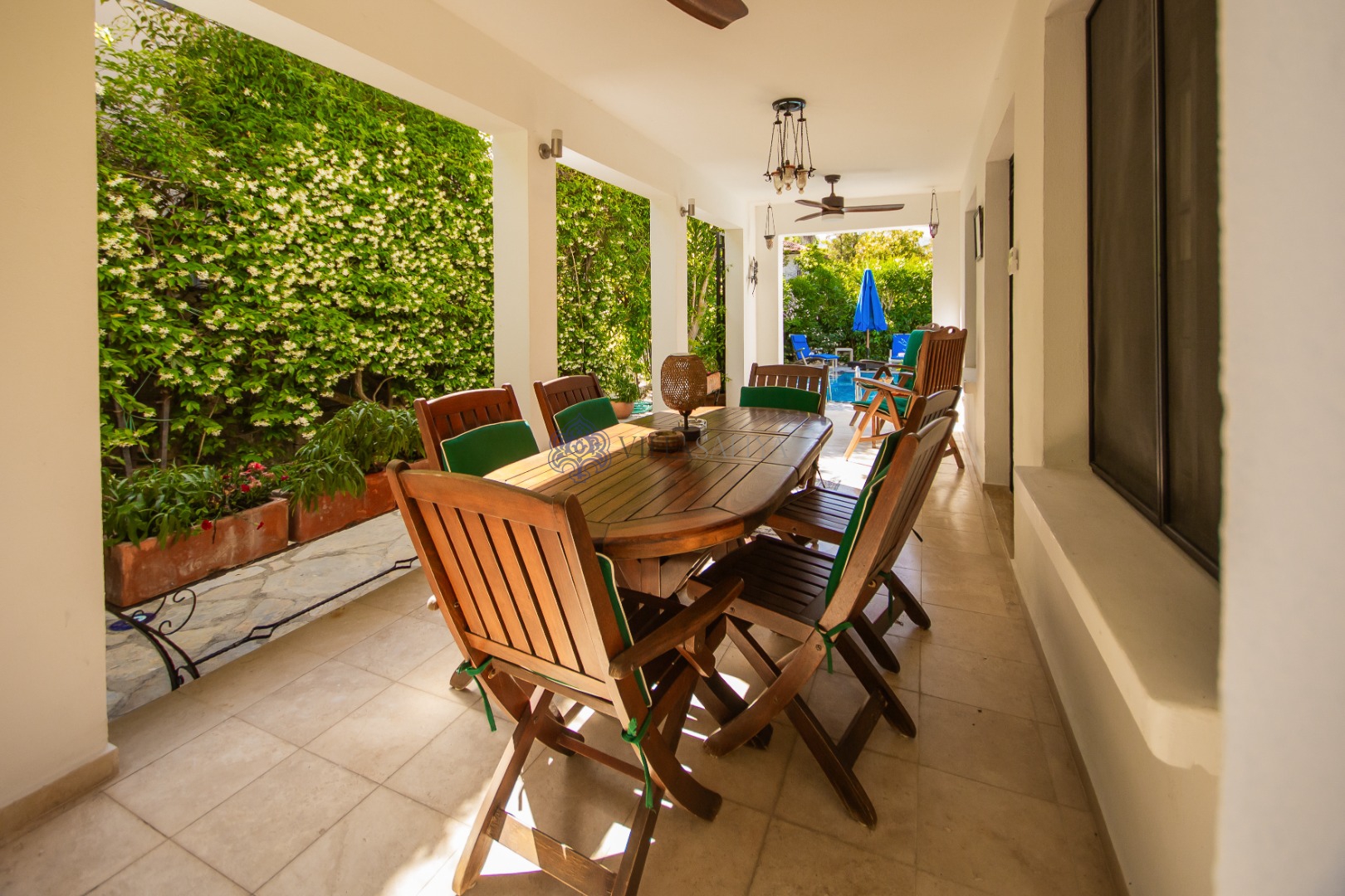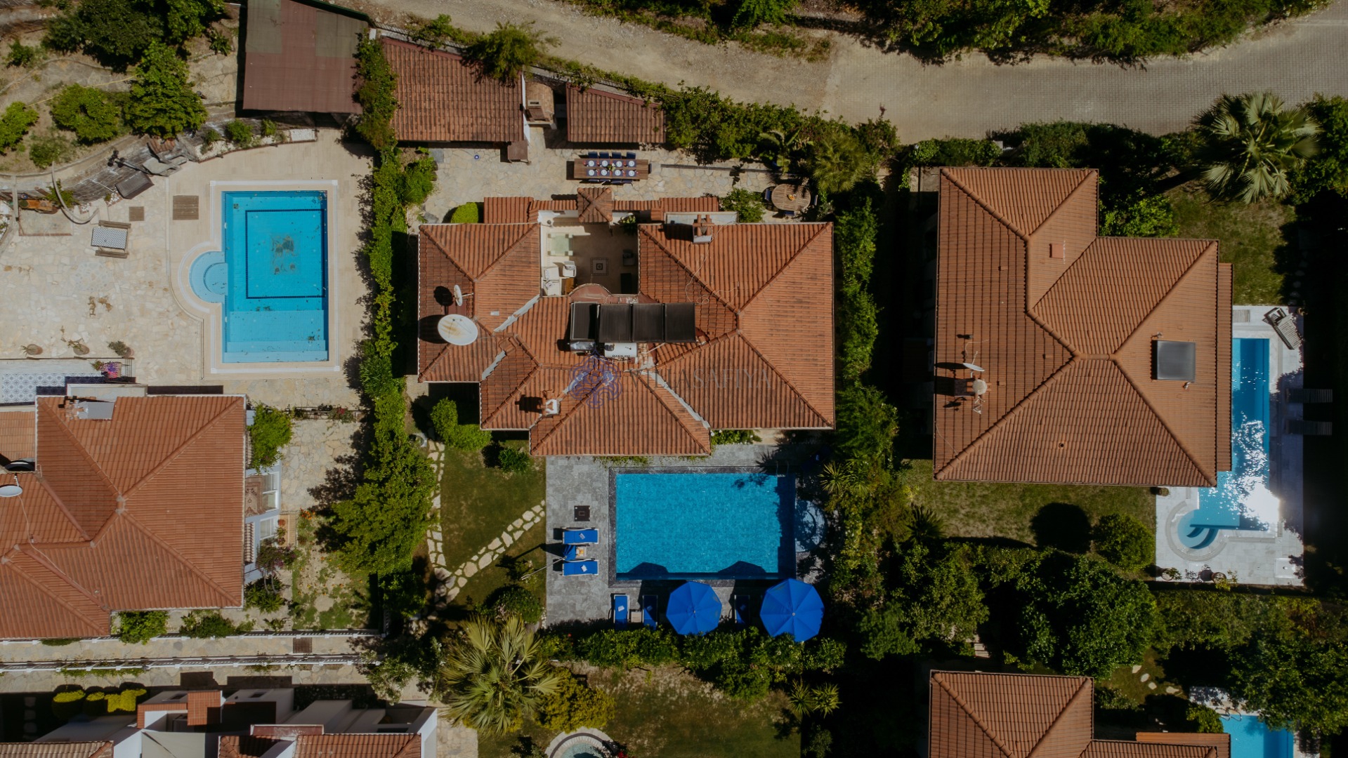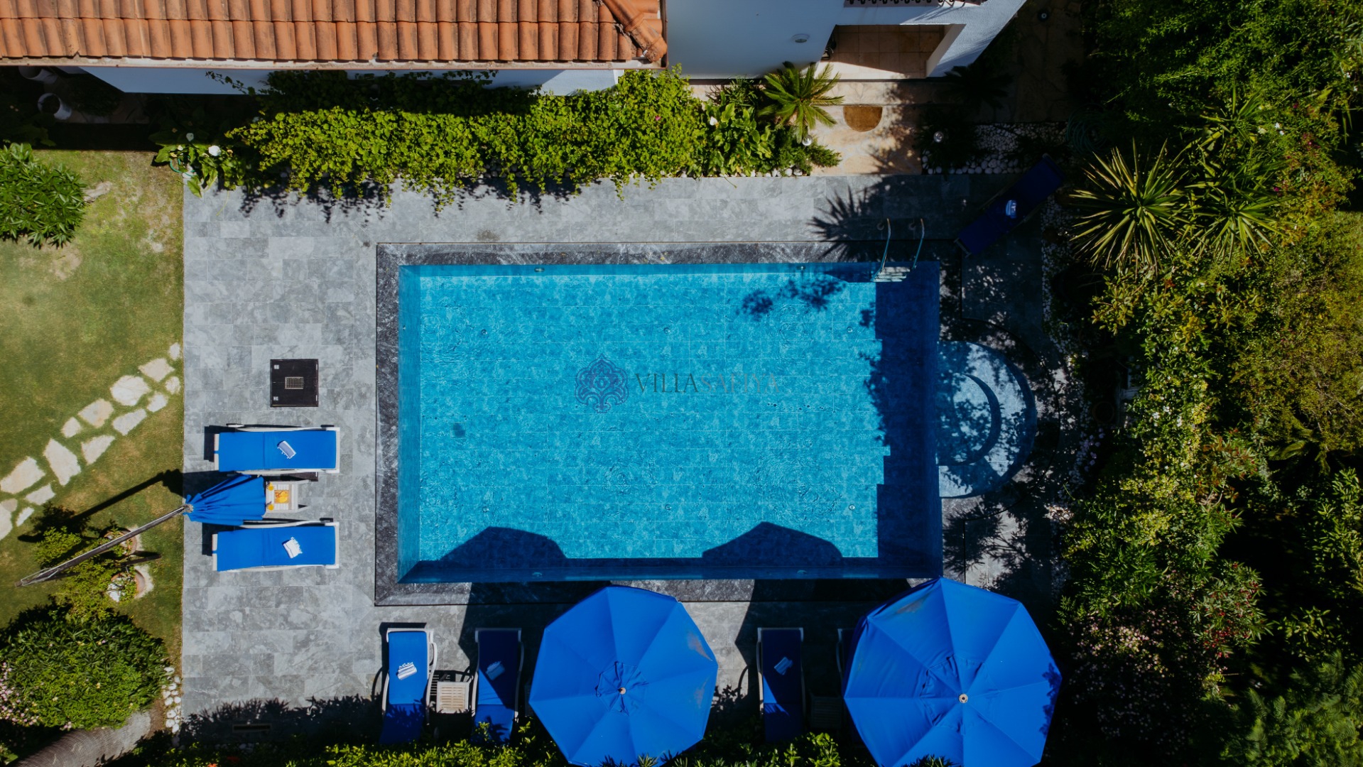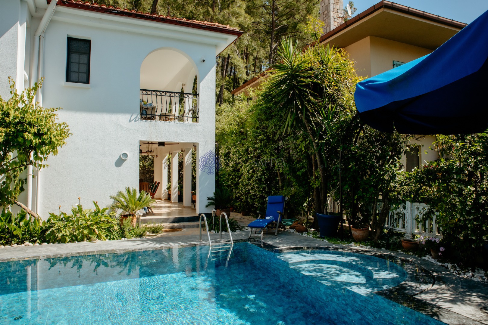 Özel Yüzme Havuzu: Güneşin tadını çıkarabileceğiniz konforlu şezlonglar ve şemsiyelerle çevrili tam müstakil havuz.